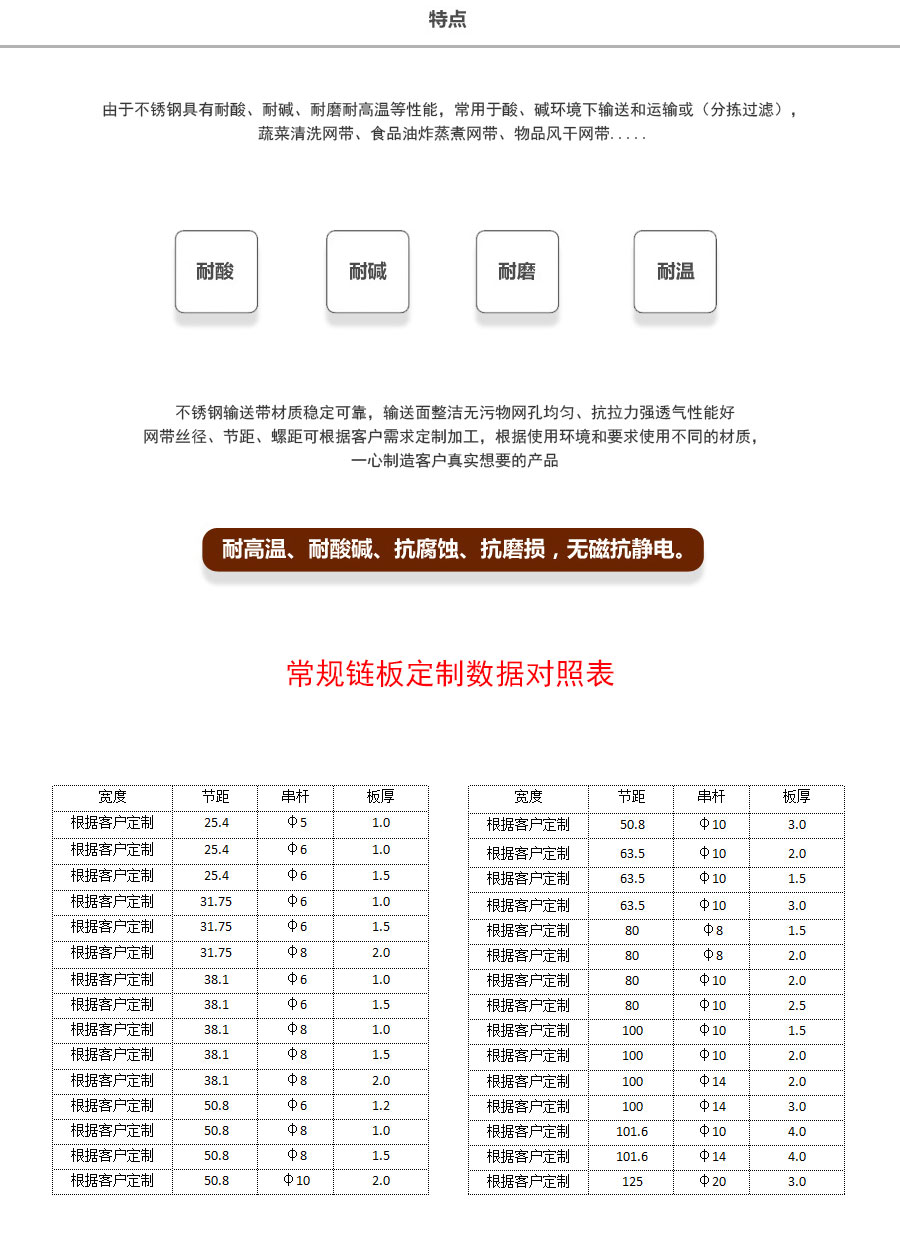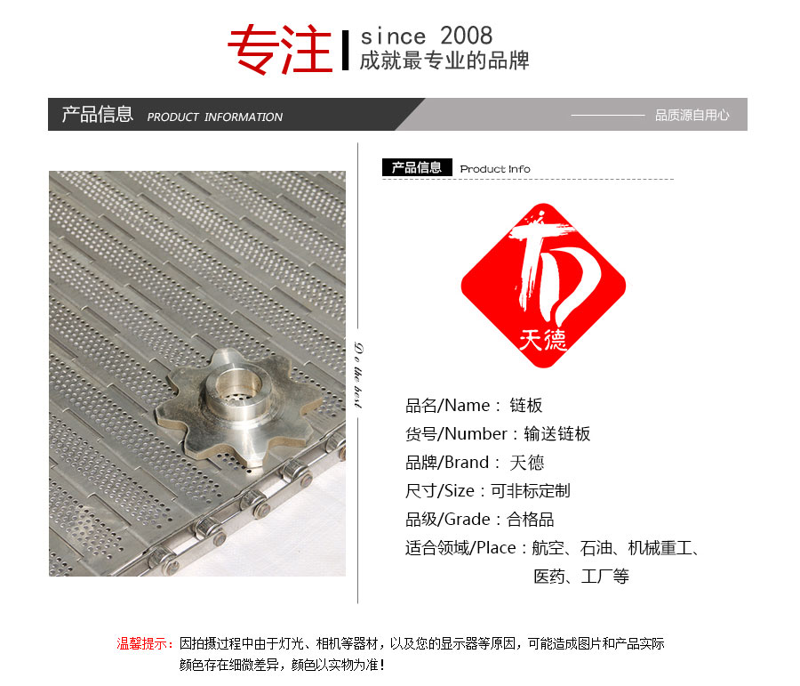 天德溫馨提示:輸送鏈板是定制產品,規(guī)格及報價會根據(jù)板厚、節(jié)距、串桿直徑、材質、寬度、長度來計算,親 也可以告訴我們使用要求、應用環(huán)境、每米載重量,由我們來幫您推薦定制數(shù)據(jù),盡力做到定制的產品即夠用也不浪費。