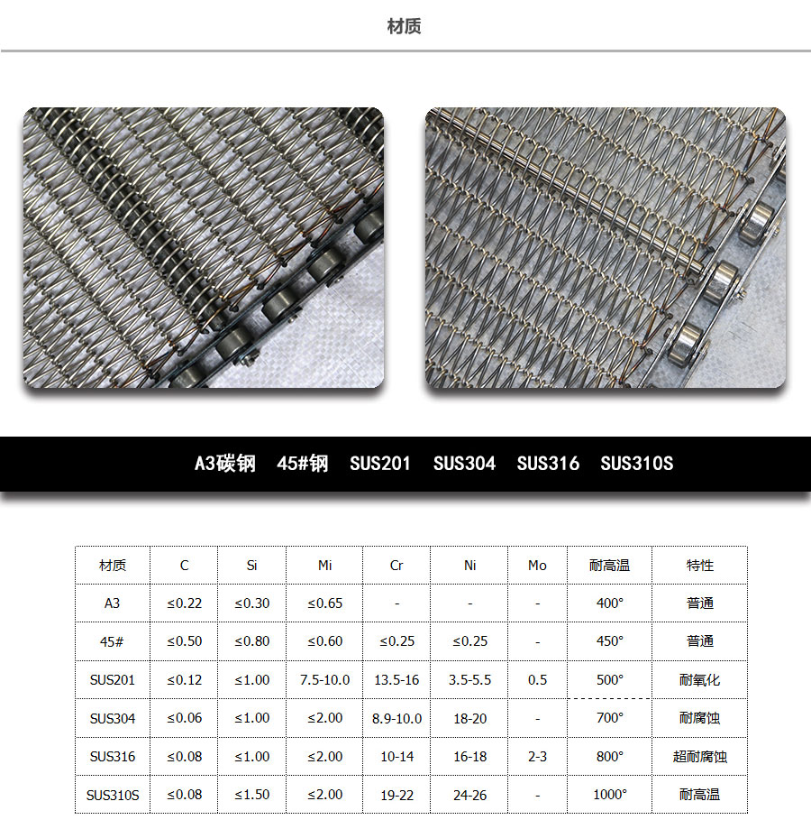 這種鏈桿式網(wǎng)帶采用鏈條傳動(dòng),適用于大型和重型傳送,其運(yùn)動(dòng)平穩(wěn)、力量大,網(wǎng)面相對(duì)受力小,能對(duì)輸送網(wǎng)面起到保護(hù)作用,成本較貴,但使用壽命長。大開孔或者小開孔網(wǎng)條;溫度范圍零下55攝氏度到1150攝氏度;邊緣擋板和橫向擋板。