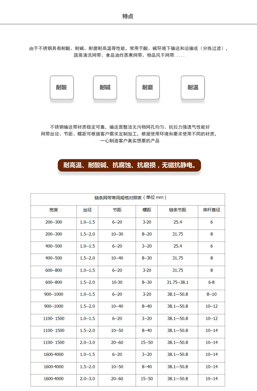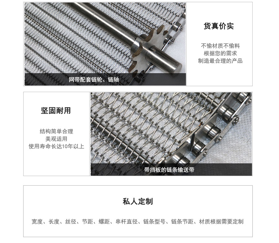不銹鋼網(wǎng)帶屬于非標(biāo)準(zhǔn)件,我們將根據(jù)你提供的規(guī)格長寬,材質(zhì),絲徑,編制結(jié)構(gòu)尺寸,支軸直徑,支軸間距,鏈條型號(hào)等數(shù)據(jù)核算成本和制作.