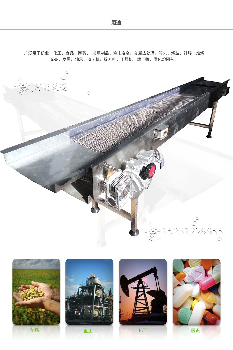 廣泛用于玻璃制品行業(yè)的退火爐網(wǎng)帶、烤花爐網(wǎng)帶等。食品加工行業(yè)、脫水蔬菜、速凍食品單凍機(jī)前處理網(wǎng)帶、鏈網(wǎng)。粉末冶金、金屬熱處理、淬火、燒結(jié)、釬焊、焙燒、光亮、發(fā)黑、軸承、滲碳高溫爐網(wǎng)帶、擋板式網(wǎng)帶、涂裝烘干線輸送網(wǎng)帶、泡沫鎳還原生產(chǎn)線網(wǎng)帶,清洗機(jī)、提升機(jī)、干燥機(jī)、烘干機(jī)、固化爐網(wǎng)帶。